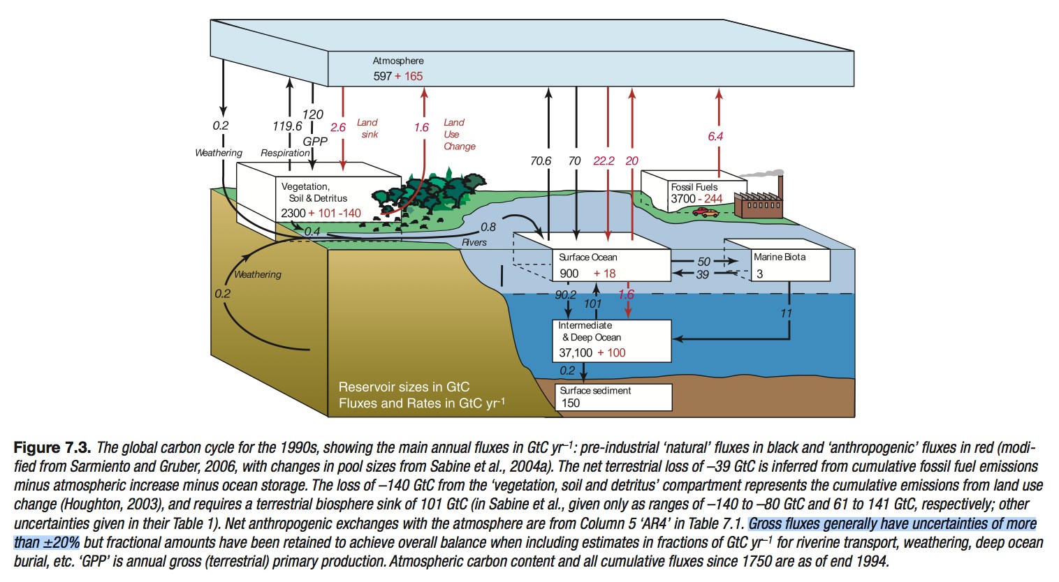 Un examen attentif de cette figure met en évidence que nos connaissances actuelles sur le cycle du carbonene permettent en aucun cas d’affirmer que les émissions anthropiques de dioxyde de carbone sont responsables de la hausse de concentration atmosphérique de ce gaz dit à effet de serre.